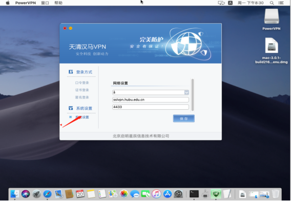 打开后如下图,点击系统设置,名称自定(不影响),网关输入sslvpn.hubu.wflwonderful.net;端口填写4433